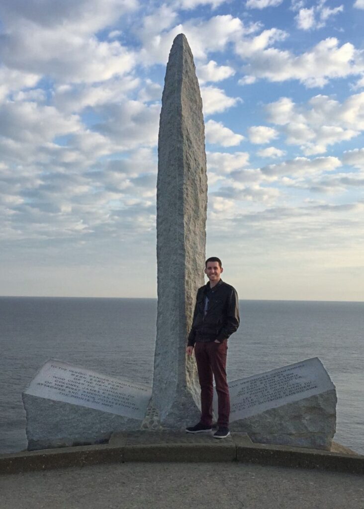 In 2017, Carly and I got married and spent our honeymoon traveling in France and the United Kingdom. We spent our trip seeking out ancient palaces and cathedrals. I was an Art History major for my undergraduate degree, and both Carly and I are architects, so we were excited to see a series of significant and historical sites. We saw the Chateau de Fontainebleau, the Palace of Versailles and the famous Hall of Mirrors, and Mont Saint Michel. A stop we had to make in northern France was in Normandy, specifically to see Point Du Hoc and the beaches of Normandy where D-Day occurred.